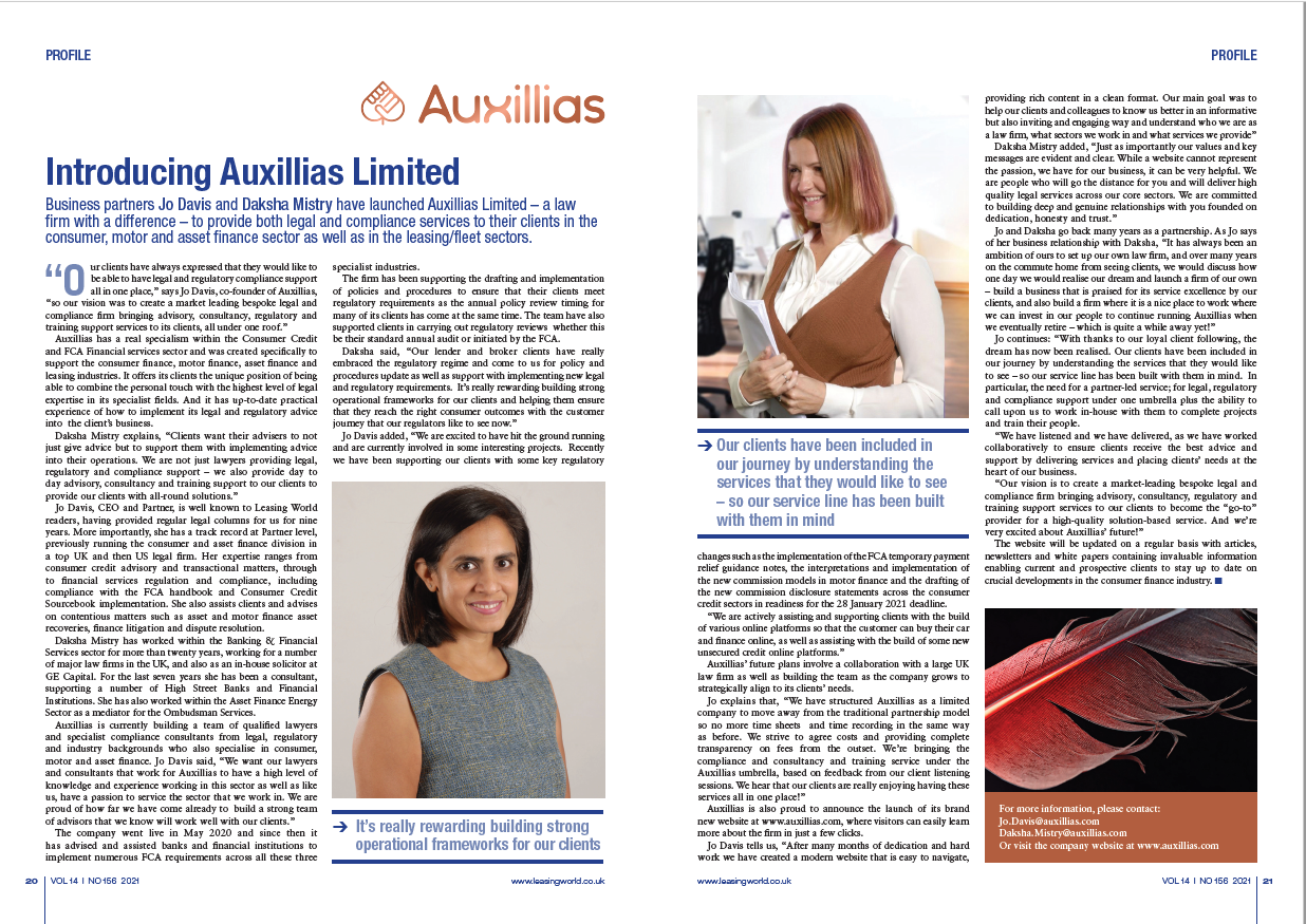 Business partners Jo Davis and Daksha Mistry have launched Auxillias Limited – a law firm with a difference – to provide both legal and compliance services to their clients in the consumer, motor and asset finance sector as well as in the leasing/fleet sectors.